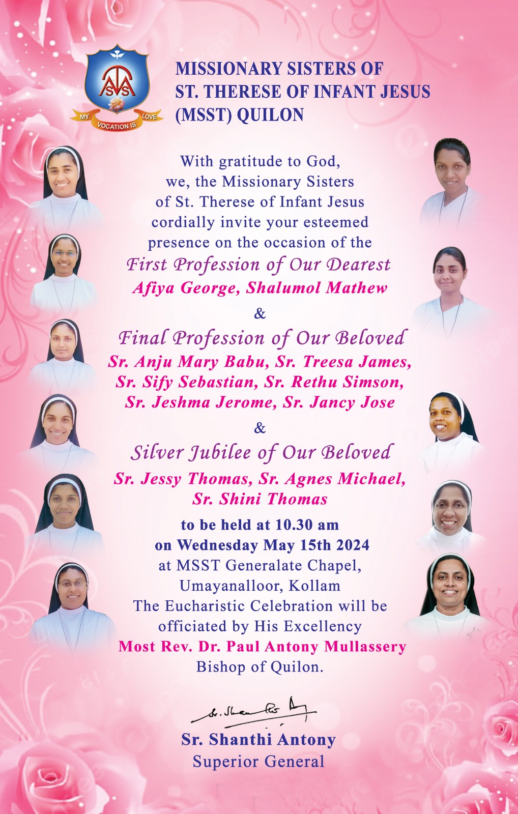 The Missionary Sisters of St. Therese of Infant Jesus (MSST), Quilon, joyfully celebrated a day of divine grace and thanksgiving on 15 May 2025 at the MSST Generalate Campus. The solemn occasion marked the First Profession of Shinu Sunny and Anjitha Gilbert, the Final Profession of Sr. Nell Cansis and Sr. Jesin George, and the […]