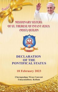May Almighty God be praised for this great honour we,the MSST Religious Congregation received from the Holy Father Pope Francis. A Red Letter Day in the history of MSST. Today (05.10.2022)His excellency Rt.Rev.Dr.Paul Antony Mullasseri, the Bishop of Quilonhanded over the Pontifical Decree to Rev.mother Shanthy Antony, the Superior General of MSST