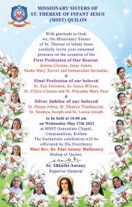 The Missionary Sisters of St. Therese of Infant Jesus (MSST), Quilon, joyfully celebrated the First Profession, Final Profession, and Silver Jubilee of their beloved sisters on Wednesday, 17th May 2023, at the MSST Generalate Chapel, Kollam.The solemn occasion marked a moment of deep faith, gratitude, and renewal of commitment to God’s mission. Sisters Jestina Cleetus, […]